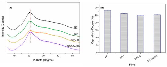 The effects of the SPI-CH conjugates on the composite films’ crystallinity structures were observed by XRD, as shown in Figure 3A. The broad characteristic peak at approximately 2θ = 22.5° reflected typical SSPS crystal conformation [23]. The XRD pattern of SPI did not exhibit obvious sharp peaks of crystalline structures, indicating a favorable chemical compatibility and physical distribution of the SPI-CH conjugates in the resultant composites [27]. For the unmodified and/or crosslinked SPC films, the typical peaks of SSPS crystallites shifted to around 23.2° and decreased in intensity after NaIO4 or Fe(III) ion incorporation mainly due to the inhibiting effects on the formation of SSPS crystallites by multiple interactions between the SPI-CH and SSPS matrix. Similar conclusions were drawn from the calculated degrees of crystallinity of the soy-based composites. We found that the SPC film crystallinity was lower than that of the control when crosslinking with NaIO4 or Fe(III) ions (Figure 3B). This likely resulted from the physicochemical crosslinking network between the amphipathic SPI-CH chain segment and SSPS matrix in accordance with the FT-IR analysis [12,39]; taken together, the robust crosslinking network was formed in the composite samples due to the strong intra- or intermolecular H-bonding and multiple physicochemical bonding.