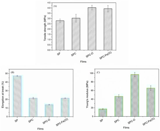 Crosslinking also may affect the films’ surface hydrophobicity due to multiple interactions in the polymeric network, as well as decreased polar groups in the film’s surface [39]. As shown in Table 4, the unmodified film had a WCAs of 25.9°, which increased to 44.7° after the incorporation of SPI-CH (p < 0.05); and increased further (55.8°) after the catechol-Fe(III) coordination crosslinking (SPC-Fe(III) film) (p < 0.05). Compared to that of reported SPI or SSPS film, it was found that integration of cross-linked SPI-CH system into the SSPS matrix results in notable improvement of the surface hydrophilicity of composite films. This observation combined with the FT-IR, XRD, and FE-SEM results indicated that multiple physicochemical interactions resulted in the re-arrangement of polar/nonpolar groups under the dense crosslinking network structure (–OH, –NH2, –COOH, and –SH), which improved the surface hydrophobicity of the composite films [22].