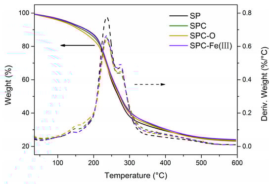 The thermal properties of the soy-based composite films were examined by TGA as shown in Figure 6. The thermo-degradation data is presented in Table 3. The soy-based composites exhibited a similar pattern of thermal behavior relative to the control film, and underwent two degradation stages: One typical, from 20 to 120 °C for the dehydration process, and another ranking from 120 to 450 °C mainly for glycerol, main backbone polysaccharide, and/or peptide decomposition [10]. Compared to the generally accepted thermo-degradation mechanism of SPI, it was found that the typical degradation peak of SPI (around 310 °C) disappeared in the composite films, suggesting a favorable combination and compatibility of biphase composites [21]. The degradation peaks in the second stage (around 235 °C) of composites significantly decreased in comparison to the control, which likely implies the enhanced thermal stability in the composite films due to the multiple physicochemical bonding between the SPI-CH conjugates and the soy-based matrix [22]. In addition, as the composite films further crosslinked, higher residual masses at 550 °C were observed in the SPC-O and SPC-Fe(III) films (Table 3); the robust network was enhanced via multiple interactions in the resultant composites, as confirmed by the FT-IR and XRD results. In conclusion, the addition of catechol-functionalized SPI facilitates slight improvement to the thermal stability of SPI-based films.