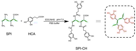 SPI-catechol conjugate was synthesized with slight modification through the carbodiimide catalyzation method: Briefly, SPI (10.0 g) was dissolved in DI water (200 mL) and stirred uniformly, and the pH of the dispersion was adjusted to 8.5 with NaOH solution (1M). HCA (4.2 g) and EDC (5.4 g) were dissolved in DI water/ethanol (100 mL, 1:1 v/v) and NHS (3.0 g) was added to the mixture to activate the carboxylic group on HCA molecules under cooling in an ice bath. After 30 min, the activated HCA solution was added dropwise to the SPI solution and the pH value of the reaction solution was maintained at 8.5 over a 24-h reaction in an ambient atmosphere. The reaction solution was dialyzed (MWCO: 8000–10,000, SpectraPor, Beckman Instruments, Mountainside, NJ, USA) thoroughly against NaOH solution (pH 8.0–8.5) for 48 h and DI water for 12 h, and then lyophilized to obtain the SPI-CH conjugate product.