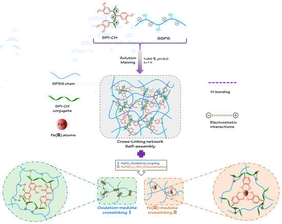 The SSPS based films were prepared freshly with SSPS and SPI-CH conjugates using a casting method. For the control film, SSPS (5 g) and glycerol (2.5 g) were dispersed in DI water and heated in a water bath at 85 °C for 1 h under vigorous stirring. To fabricate SPI-CH crosslinked SPSS films, a predetermined amount of SPI-CH, Fe(NO3)3·9H2O or NaIO4 (as listed in Table 1) was dispersed in the SPSS (5 wt %) solution with the aid of plasticizer glycerol (50% based on the weight of SSPS) and constantly stirred for 1 h at 85 °C. The mixture was then ultrasound-treated (VC-750, Sonics and Materials, Danbury, CT, USA, 750 W) for 15 min and poured into Teflon-coated plates, then vacuum-dried at 45 °C for 24 h.