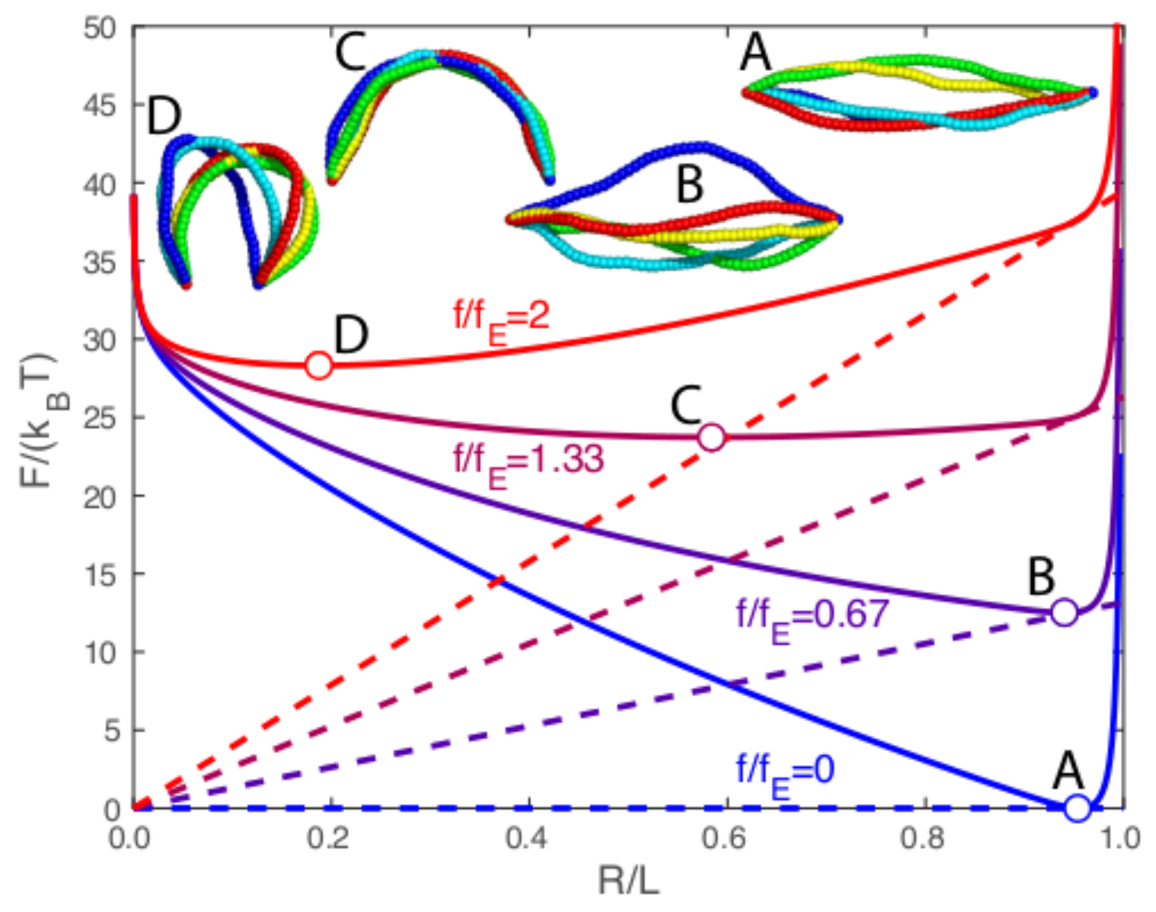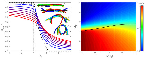 Figure 1 also provides a procedure for mapping out the minimum free-energy end extension versus the compressive force f for a fixed chain length, shown in Figure 2. The left side of Figure 2 shows versus f for chain lengths ranging from (blue curve) to (red curve). The compressive force ranges from to , where negative values correspond to a worm-like chain under tension. The dashed curve in Figure 2 shows the zero-temperature (i.e., no fluctuations) end extension [9], and the dotted vertical line gives the zero-temperature critical force . The inset images show realizations from Monte Carlo simulations at the same four force values as in Figure 1. We note that the Monte Carlo images in Figure 1 have a fixed end extension given by , whereas the Monte Carlo images in Figure 2 are from simulations with a fixed force f, and the ends undergo thermal fluctuations as dictated by the shape of the free energy curve. The large fluctuations of chain conformations seen at points C and D in Figure 2 are not surprising, given how flat the free energy curves are for C and D in Figure 1.