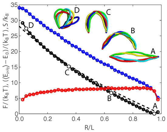 Thermodynamic contributions to the free energy F for a worm-like chain versus the end-to-end distance R. The free energy F (black dots) is determined using our exact analytical treatment (Equation (4)). The average polymer energy (blue dots) is found from discretized Monte Carlo simulations, and the entropy S (red dots) is calculated from . The dashed curve is the zero-temperature bending energy, and the four Monte Carlo conformations span the range of end retractions.