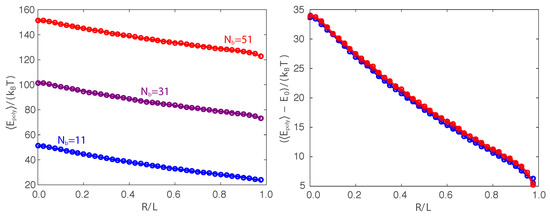 Our Monte Carlo simulations provide a framework to evaluate the change in the average polymer chain energy with end extension, provided we can reliably translate the discrete chain behavior to the continuous limit. We perform several simulations with an increasing number of beads to determine the average polymer chain energy . The left plot of Figure A1 shows results from Monte Carlo simulations of a polymer chain of length with bead number (blue), (purple), and (red). These results demonstrate the increase in the average polymer chain energy with the number of beads, reflecting the divergence in the energy as the number of degrees of freedom increases. However, the thermodynamic contribution from these active modes is easily interpreted and eliminated from these results. Since each bead has a position and orientation, there are five degrees of freedom per bead. Thus, a free chain has an average polymer chain energy predicted from the equipartition theorem to be . We define a reference energy that includes the free-chain energy in order to eliminate the contribution from discretization; the factor of four is a convenient choice for visualization of the results in Figure 3. The right plot of Figure A1 shows our simulation results for average polymer chain energy (i.e., subtracting the reference energy ) for bead number (blue), (purple), and (red). The coarsest discretization (, blue) exhibits slight numerical deviations from the results from simulations with (purple) and (red). With increasing , the average polymer energy is invariant to the number of beads , and we can interpret the average polymer energy as the thermalized deformation energy of a buckled polymer chain. The entropy S is then found from our exact results for the free energy F and the average polymer energy using the thermodynamic expression . Our results for these thermodynamic contributions based on Monte Carlo simulations with are shown in Figure 3.