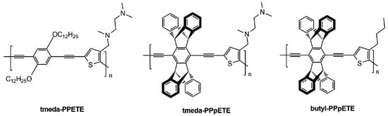 In the attempt to decrease the effect of polymer self-quenching and π-stacking, a pentiptycene monomer was introduced into the polymer backbones. The rigid three-dimensional sterically hindered framework of the polymer backbones is known to prevent π-stacking of polymer chains [29]. When combined with other groups, pentiptycene can also be part of the analyte capture and recognition unit for cations and anions in small molecule sensors [30,31]. In the interest of developing cation recognition FCPs containing the pentiptycene unit, the synthesis of tmeda-PPpETE (poly[(pentiptycene ethynylene)-alt-(thienylene ethynylene)] with a N,N,N′-trimethylethylenediamino receptor) and its model polymer butyl-PPpETE are presented, together with detailed photophysical studies and sensing abilities of this new material (Figure 1).
