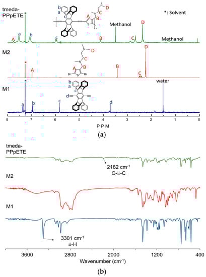 (a) 1H-NMR (600 MHz, CDCl3) and (b) FT-IR of the tmeda-PPpETE polymer and the corresponding monomers.