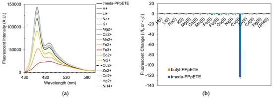 Fourteen representative metal ions (Li+, Na+, K+, Mg2+, Ca2+, Mn2+, Fe2+, Fe3+, Co2+, Ni2+, Cu2+, Zn2+, Cd2+, Hg2+) as well as H+ and NH4+ cations were selected as representative analytes in this study. The cation titrations were carried out under the same conditions as previous studies with both the concentration of the polymer and the analyte held at 5 µM [44,45]. The average values of the fluorescent intensity (I) and the intensity change at the emission maximum upon titrating cation solutions were shown in Figure 4 (for fluorescent enhancement, the intensity change was expressed as I/I0; for fluorescent quenching, the intensity change was expressed as −I0/I, where the negative sign means the decrease in fluorescent intensity). As an electron-rich group, the pentiptycene tends to be attracted to electron withdrawing groups [29,40,41]. However, its interactions with metal cations are less well known in the literature. Yang et al. [30] presented a pentiptycene-bispyrenyl system, which was selective towards Ca2+ and Cd2+. In addition, a blue shift was observed in response to Cu2+, where the cation interacted with the system through a cation-π interaction. To study the mechanism of the metal cation binding, whether it is solely dependent on the diamino group or the pentiptycene group, played a role in the binding, metal cation screening was also performed on the model butyl-PPpETE polymer in the same manor.