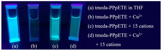 As shown in Figure 5, an interference study was carried out. Cuvette (a) contains the tmeda-PPpETE solution in THF, which showed an intense blue fluorescence under UV light. Cuvette (b) was the polymer solution upon addition of Cu2+, and the fluorescent quenching effect was visible to the naked eye. In Cuvette (c), 15 selected cations were added to the polymer solution, and the result was a slight decrease in fluorescent intensity, which was consistent with the fluorescent emission spectra. This was because Fe2+, Fe3+, Co2+ and Ni2+ can also partially quench the fluorescence, however not significantly. Cuvette (d) contained all the cations including Cu2+, which quenched the fluorescence significantly, demonstrating that tmeda-PPpETE can be a viable Cu2+ sensor. Comparing cuvette (b) and (d), it was noted that a small portion of fluorescent present when there was interference from other cations. In the previous study [46], the polymer tmeda-PPETE was preloaded with Cu2+, which quenches the initial fluorescence, and then a metal–polymer hybrid system can work as a turn-on sensor for iron cations. It is possible that, in the case of tmeda-PPpETE, a similar process was present where a tmeda-PPpETE/Cu2+ complex may be a turn-on sensor for other cations. Further studies are needed to explore the multi-ion interaction with tmeda-PPpETE.