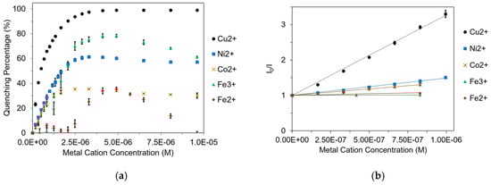 where I0 and I are the fluorescence intensity of the polymer before and after the addition of metal ions; and Ksv is the Stern–Volmer quenching constant. The results and linear regression are shown in Figure 6b and the values are tabulated in Table 2.