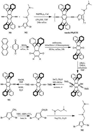 The monomers, N-(2,5-dibromothiophene-3-ylmethyl)-N,N,N′-trimethylethan-1,2-diamine and 6,13-diethynyl-5,7,12,14-tetrahydro-5,14:7,12-bis([1,2-benzeno) pentacene, were prepared by modifying previous literature methods (Scheme 1) [9,33,34,35]. The polymers, tmeda-PPpETE and butyl-PPpETE were prepared by a step growth polymerization via Sonogashira reaction: a palladium catalyzed cross-coupling of aromatic halides on the thiophene ring and the terminal alkynes on the center ring of the pentiptycene group. Synthesis of butyl-PPpETE can be found in the supplementary materials.