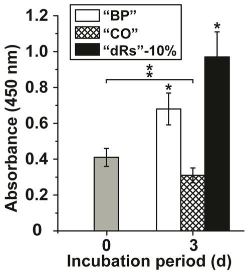 The effects of the microparticles on growth of MSC were tested in the XTT metabolic analysis assay. The concentration added to the cultures was 10 µg/mL (concentration with respect to the applied paste). After a short incubation period of 3 h the absorbance was determined and found to be 0.41 ± 0.051 absorbance units at 450 nm (Figure 2); set to time 0. After a three-day incubation the absorbance in the assays with the test samples was determined again. In the control assay, the base paste “BP”, the absorbance increased significantly to 0.68 ± 0.089 absorbance units and in the paste supplemented with 10% microparticles containing retinyl acetate (“a-polyP/RA-MP”) and termed “dRs”-10% to 0.97 ± 0.14. If the cells were incubated in the presence of the lower concentration polyP microparticles paste (“dRs”-1%) the increase in the absorbance units was smaller, but still significant, with respect to the controls (0.53 ± 0.061 absorbance units; data not shown in Figure 2). In contrast, the “CO” sample was significantly inhibitory, as can be deduced from the decrease of the absorbance to 0.31 ± 0.048 (Figure 2).