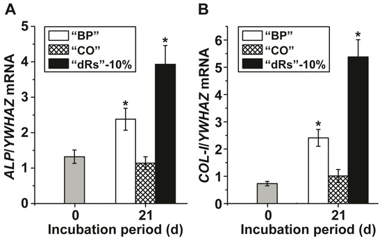 Steady-state expression of the: (A) ALP; and (B) COL-I genes in MSC, cultured in the presence of the mineralization activation cocktail, MAC, after an incubation period for 21 days. Immediately after seeding the cells the expression ratio for the ALP gene or of the COL-I gene versus the YWHAZ house-keeping gene was determined (time zero); grey bars. The MSC were incubated with 10 µg/mL of “BP” (open bars), “CO” (cross-hatched) or “dRs”-10% (filled bars). After incubation the cells were harvested and the RNA was extracted and subsequently subjected to RT-qPCR analysis. The expression values are given as ratios to the reference house-keeping gene YWHAZ. The results are means from five parallel experiments (* p < 0.01).