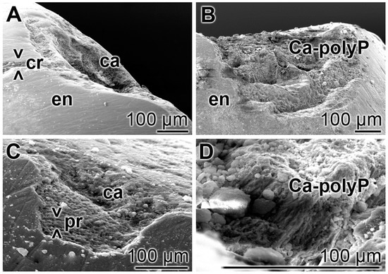 Treatment of the carious tooth lesion damages in the enamel region; SEM. The tooth sections were treated either: (A,C) with the control paste “BP”; or (B,D) with “dRs”-1% twice a day for five days. In the control “BP” samples, cracks (> < cr) remained and the deep carious lesions uncover the separately existing enamel (en) prisms (> < pr). In contrast, in the “dRs”-1%-treated specimens no cracks could be detected in the smooth surface and the dental carious cavities (ca) are filled with amorphous Ca2+-polyP (Ca-polyP), originating from the “dRs”-1% paste.