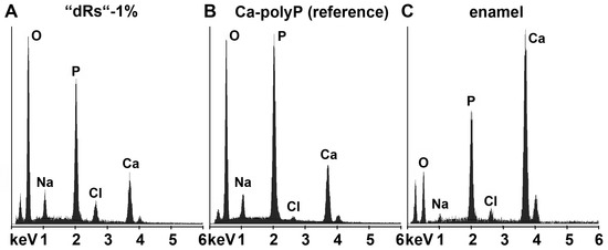 Energy-dispersive X-ray analysis plot obtained for the deposits in a caries cavity, that was brushed for (A) five days with “dRs”-1%. In comparison, the spectra for: (B) the “a-polyP/RA-MP” (Ca-polyP [reference]) material added to the “dRs”-1% paste; and (C) enamel are also given.