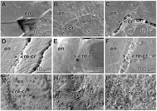 Closure of the cracks within the enamel region by polyP; SEM: (A–C) Treatment of the tooth samples with “BP”. The crack damages (cr) are constantly seen; (D–F) Brushing of the teeth with “dRs”-1% results in a repairing of the cracks (> < re-cr) within the enamel region (en); (G–I) At a higher magnification, the globular, spherical microparticles, originating from the polyP microparticles in the “a-polyP/RA-MP” sample that were fabricated into the “dRs”-1% paste become visible.
