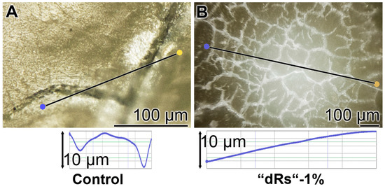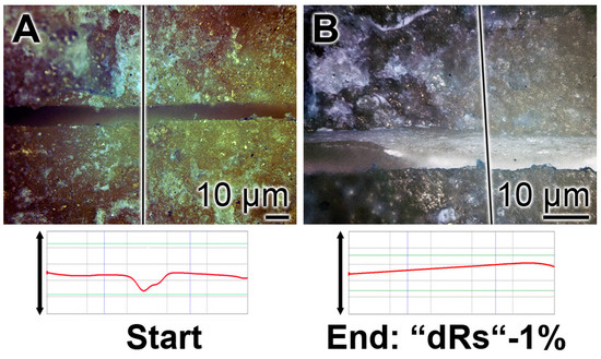 The surface roughness of those closed cracks are assessed using the Keyence light microscope and applying the software designed for it. The determinations revealed that the cracks within the dentin region, using the respective tooth specimen, are deep and measure ≈ 10 µm (Figure 12A). After treatment of the dentin sample with “dRs”-1% paste, a smooth surface is recorded (Figure 12B). This finding indicates that the surface of the “dRs”-1%-treated specimen is not rough at all but comparably smooth (Figure 12B [lower panel] versus Figure 12A [lower panel]).