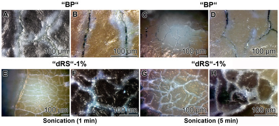 Resistance of the “dRs”-1%-mediated sealant against sonication. The teeth samples were brushed either: with “BP” (A–D); or with “dRs”-1% (E–H). Subsequently, the samples were either sonicated: for 1 min (A,B,E,F); or for 5 min (C,D,G,H). The lengths of the scale bars refer to 100 µm.