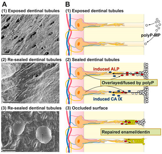 Occlusion of the dentinal tubules by the polyP-based and microparticle-formulated “dRs”-1% paste. In the first step the microparticles adsorb to the HA surface where in the second step an ALP-driven hydrolysis of the polyP within the microparticles takes place, resulting in a lowering of the pH. After this resealing phase the dentinal tubules are occluded by a genuine repair process. The different phases are illustrated: (A) by the respective SEM images; and (B) by the corresponding sketches.
