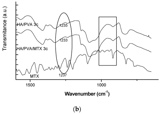 ATR-FT-IR spectra of HA/PVA unloaded and MTX-loaded cryogels (a) for the entire spectral range (b) for spectral range between 1800 and 500 cm−1.