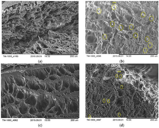 SEM images of (a) HA/PVA 2c; (b) HA/PVA/MTX 2c; (c) HA/PVA 3c; (d) HAPVA/MTX 3c.