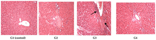 Liver reactivity: in G1 (control), G2, G4 normal hepatic morphology was maintained; G3 revealed a dilated congestive central vein and inflammatory areas. The arrows in G3 indicate some alterations.