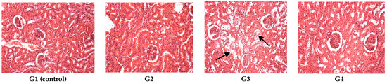 The kidney had a normal configuration in G1 (control), G2, G4, while in G3, epithelial degeneration was observed in the renal tubules; tubular alterations occurred in most of the proximal convoluted tubules and to a lesser extent in the distal tubules (indicated by arrows in Figure 5). The glomeruli and the renal blood vessels remained intact (Figure 5).