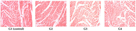Cardiac histopathologic exam revealed a normal histologic aspect of the heart for G1 (control), G2, G3 and G4. HE stain, ob. ×20.