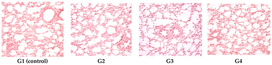 Pulmonary histopathologic exam revealed a normal configuration of the lungs for G1 (control), G2, G3 and G4. HE stain, ob. ×20.