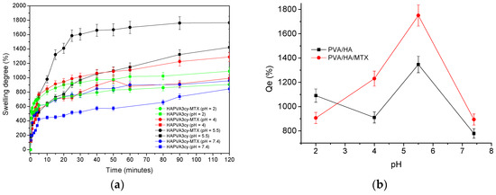 Swelling profiles at different pHs values of the unloaded and MTX-loaded HA/PVA based matrices (a) and dependence of the Qe on pH (b).
