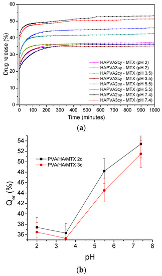 MTX is used in the treatment of a variety of illnesses including cancer, rheumatoid arthritis, systemic lupus erythematosus, and psoriasis. It is delivered intravenously, intramuscularly, orally and intrathecally. MTX toxicity develops due to increased patient susceptibility during treatment, excessive parenteral or intrathecal administration, therapeutic errors by patients, self-administration to induce abortion, or intentional oral overdoses. Toxic effects may occur hours to days to weeks after MTX administration or overdose [52]. MTX is slightly soluble in dilute hydrochloric acid, but is soluble in dilute solutions of alkali. A 20- and 12-fold increased solubility was found when pH increased from 5 to 7. Aqueous solutions can be prepared by dissolving in aqueous buffers. The solubility in PBS 7.2 is ~1 mg/mL. It is not recommended to store solution more than one day [53]. Several pKa values are given in literature for MTX as 4.70 5.6, 4.8, and 3.8 (carboxylic acid) [54,55]. All these characteristics of the HA and MTX will give a pH responsiveness of the MTX-loaded PVA/HA cryogels. Swelling profiles of the unloaded and MTX-loaded HA/PVA cryogels in the media of various pH are presented in Figure 9a.
