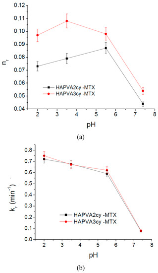 pH effect of on release parameters of MTX from PVA/HA matrices (a) diffusion exponent nr and on the (b) kinetic constant kr.