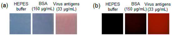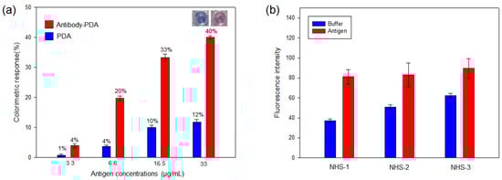 The NHS ester of PCDA is made to create reactive acylating agents, and the reaction with the amine groups of antibodies produces the conjugate of the antibody-PDA. In the present work, the M149 antibody was coupled with PCDA and DMPC mixed vesicles using NHS ester-mediated acylation. For enhanced fluidity and sensitivity without interrupting the chromatic properties of the PDA, 40% DMPC was distributed within the conjugated PDA [16]. To optimize the composition, the antibody-PDA conjugates were fabricated with three different NHS-PCDA ratios (10%, 20% and 30%). In the antibody-PDA conjugates, the blue-to-red color transition was clearly observed after adding the virus antigen; however, the unmodified PDA vesicles showed low and saturated CR% values against antigen concentrations (Figure 1a and Figure S1). This result indicates that the molecular recognition of the antibody–antigen was successfully expressed as a color shift, whereas, nonspecific electrostatic interactions might induce the small increase in CR% [24] In succession, the fluorescence intensities were measured for the three modified PDA systems, and the 10% NHS-PCDA showed the largest fluorescent enhancement (Figure 1b). The fluorescence in the absence of the antigen was due to the incubation at 37 °C and the bulkiness of the modified group. For PDA-based sensing platforms, 10% modified PCDA has also been used in other reports [25,26]. Taken together, the NHS-1 composition was selected to detect the viral antigens.