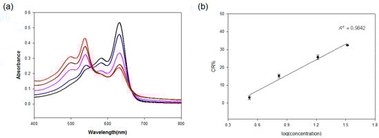 (a) Visible spectroscopy for different antigen concentrations (0 (black), 3.3 (blue), 6.6 (pink), 16.5 (brown), 33 µg/mL (red)); (b) Correlation curve between the CR% and log (concentration of the virus antigen). All experiments were performed in triplicate.