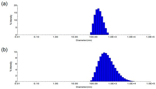 Dynamic light scattering (DLS) profile of the antibody-conjugated PDA nano-vesicles. (a) Without virus antigen; (b) With virus antigen.