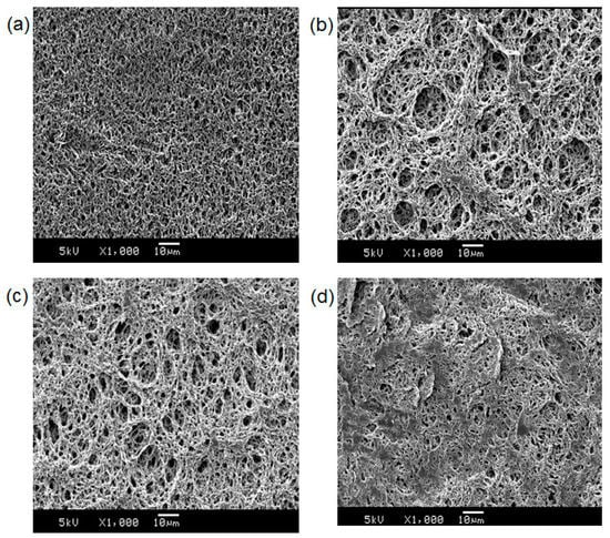 SEM images of the (a) original PVDF; (b) buffer-treated antibody-PDA coated PVDF; (c) BSA-treated antibody-PDA coated PVDF; and (d) virus antigen-treated antibody-PDA coated PVDF.