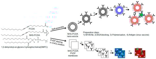A mixture of 1 mM NHS-PCDA vesicle solution (1 mL) and M149 antibody (1 μg/mL) was incubated at 4 °C overnight. Any remaining NHS groups were blocked by reacting with the amine groups of BSA (150 μg/mL) in HEPES buffer for 1 h at 4 °C. The antibody modified vesicle solution was polymerized by UV irradiation for 5 min. [23].