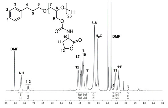 The number of HSL groups attached to PG26 (5) was calculated by comparing the signal intensity of one methylene group of the 3-phenyl-1-propanol (Signal 5) used in the synthesis of 5 with signals 11 and 12. The absolute molecular weight (Mn,NMR) was calculated likewise using the 3-phenyl-1-propyl end group as an internal reference (Mn,NMR = 5247 g·mol−1). Full functionalization of PG26 (5) was reached.