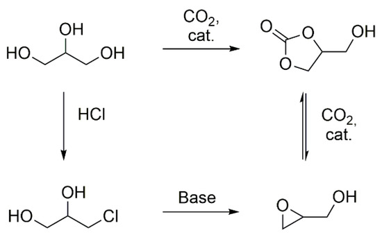 Strategies for the synthesis of glycerol carbonate and glycidol from glycerol [9].