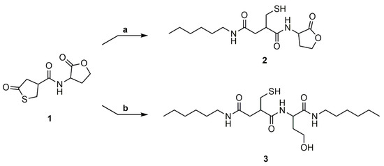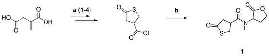γ-Thiobutyrolactone β-acid chloride was synthesized from itaconic acid and thioacetic acid, followed by reaction with thionyl chloride and then purified by distillation (Scheme 3a) [33]. The acid chloride was reacted with DL-homoserine lactone hydrobromide and pyridine as an acid scavenger at room temperature and then purified by flash column chromatography (Scheme 3b).