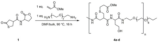 Polyaddition reaction of PEG-Diamine to thiolactone-lactone coupler (1) in the presence of methyl acrylate. Products were synthesized in various concentrations of 1 in DMF (4a: 0.5 M; 4b: 1.0 M; 4c: 1.5 M) and in bulk (4d).