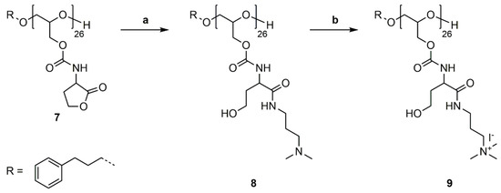 P(GHSL)26 (7) was reacted with 3-(dimethylamino)-1-propylamine (DMAPA) and 4-DMAP as a nucleophilic catalyst in a ring-opening reaction in DMF at room temperature (Scheme 7a). The synthesized P(GHSL,o)26 (8) was purified by precipitation in diethyl ether, followed by dialysis in MeOH and characterized by 1H, 13C NMR spectroscopy and SEC analysis (Figures S22–S24).