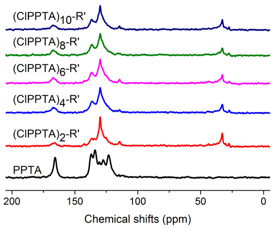 Moreover, the 13C NMR spectra are further adopted in determining the chemical structure of hydroxyl and ethylene groups in functional aromatic polyamides. As shown in Figure 2, the solid state CP/MAS 13C spectra of the PPTA and ((ClPPTA)m-R′) are similar to a certain extent. For the ((ClPPTA)m-R′), the peak at 32.8 ppm is attributed to the carbon atoms of CH2/CH from the hydroxyl-terminated liquid nitrile rubber, the carbon of C–N bonds of the hydroxyl-terminated liquid nitrile rubber is demonstrated at 114.2 ppm. In addition, the ((ClPPTA)m-R′) shows two peaks at 129.7 and 136.7 ppm, which are assigned to the carbon atoms on the phenyl ring and the CH=CH of hydroxyl-terminated liquid nitrile rubber, respectively. The peak exhibited at 167.5 ppm is assigned to C=O. All this information confirms that hydroxyl and ethylene-functional aromatic polyamides have been successfully synthesized.