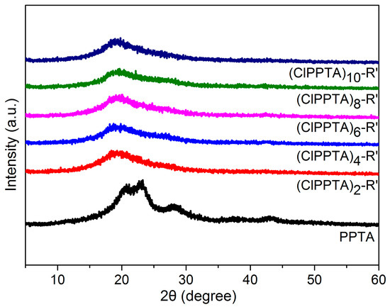 The wide-angle X-ray powder diffraction patterns of the PPTA and ((ClPPTA)m-R′) are exhibited in Figure 3. PPTA showed three broad diffraction peaks, observed at 2θ = 20.7° (d = 0.42 nm), 23.1° (d = 0.38 nm), and 28.4° (d = 0. 31 nm), owing to (110), (200), and (004) planes, respectively. In the case of hydroxyl and ethylene-functional aromatic polyamides, only one diffraction peak at 2θ = 19.7° was observed, indicating a completely amorphous packing of macromolecules. It can be explained that the chlorine substituent disrupted the regularity and crystalline of the hydroxyl and ethylene-functional aromatic polyamides. In addition, the introduction of hydroxyl-terminated liquid nitrile rubber leads to a decreased rigidity of the ((ClPPTA)m-R′).