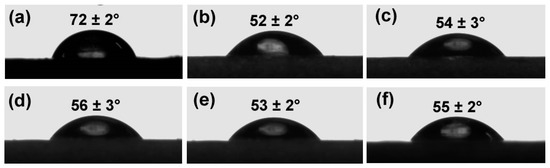 From the point of industrialization, the good wetting behavior of the film surface plays a significant role in improving the miscibility of the interface. Figure 5 shows the static water contact angle tests of the PPTA and ((ClPPTA)m-R′) films, respectively. The contact angles of the ((ClPPTA)m-R′) films (Figure 5b–f) are much lower than that of PPTA films (Figure 5a), implying that the hydroxyl and ethylene functional groups would highly improve the wettability and affinity of aromatic polyamides toward the water. Simultaneously, it can be found that the contact angles of ((ClPPTA)m-R′) films (Figure 5b–f) didn’t vary significantly. It is probably due to the size of the contact angle being related to the introduction of the active functional group and has nothing to do with the molecular weight.