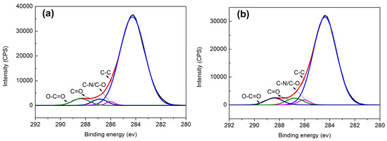 C 1s spectra of unsized (a) and sized (b) aramid fibers.