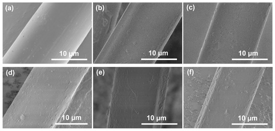 SEM images of (a) unsized aramid fiber (AF) and (b–f) the sized ones: (b) AF-(ClPPTA)2-R′-1.5%; (c) AF-(ClPPTA)4-R′-1.5%; (d) AF-(ClPPTA)6-R′-1.5%; (e) AF-(ClPPTA)8-R′-1.5%; and (f) AF-(ClPPTA)10-R′-1.5%.