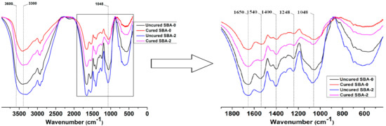 FTIR spectra of uncured SBA-0, cured SBA-0, uncured SBA-2 and cured SBA-2. FTIR = Fourier transform infrared spectroscopy; SBA = soy flour-based adhesives.