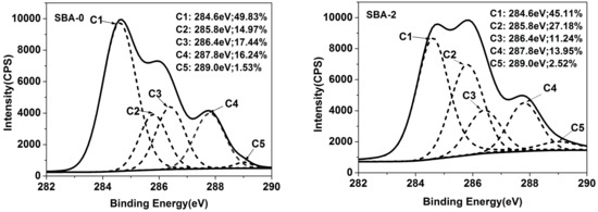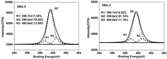 X-ray photoelectron spectroscopy (XPS) analysis. Cured SBA powder samples were pressed at 20 MPa for 3 min for XPS analysis on an ESCALAB250 XPS apparatus (Thermo Fisher Scientific) equipped with an Al K source. For all samples, a low-resolution survey run was performed. The C1s group concentration was obtained from high-resolution spectra (each sample was scanned four times for spectrum integration) run at a pass energy of 20 eV with an increment of 0.1 eV. The binding energy scale was referenced to the charge of the C1s group at 284.6 eV. The Shirley background subtraction method was used for the fitting procedure. Curve-fitting analysis of the C1s and N1s groups was performed using the Gaussian–Lorentzian (70%/30%) curve-fitting function in XPS Peak 4.0. software.