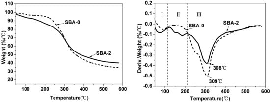 Cross-linking of proteins and reducing sugars leads to a more compact network structure, which contributes to improvements in the mechanical properties of the cured SBA [36]. TGA was performed to verify the influence of cross-linking on the thermal stability of the SBA (Figure 3). As shown in Figure 3, there were three distinct stages of weight loss, which were presumably caused by the evaporation of residual moisture, and the post-curing and decomposition of adhesives, respectively [39]. After acid hydrolysis treatment, two new peaks appeared at stage II in the curve of SBA-2, which could be assigned to water generated from Maillard reactions between reducing sugars and soy protein. Although there were no obvious differences in the main decomposition temperature between SBA-0 and SBA-2, the weight loss of SBA-2 was distinctly lower. This suggests that acid hydrolysis of carbohydrates improved the thermal stability of the SBA, and further confirmed the previous FTIR and XPS analyses.