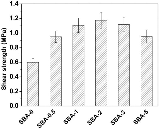 Gluability. Three-layer plywood samples were made under the following conditions: 160 g/m2 of a SBA was spread for each veneer layer under static pressures of 1.2 MPa at 160 °C for 1.0 min·mm−1. After hot pressing, plywood samples were stored under ambient conditions for at least 24 h before the shear strength was tested. Shear strength was determined according to the Chinese National Standards GB/T 9846-2015. Ten plywood specimens (100 mm × 25 mm) were soaked in water at 63 °C for 3 h, then dried at room temperature for 10 min. Shear strength was measured via a MTS tensile testing machine (MTS, CMT5504, Shenzhen, China) at a crosshead speed of 10 mm/min. Microsoft Office Excel 2007 was the software used for data analysis (Tukey test).